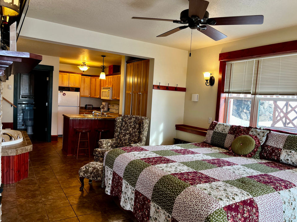 This is a smaller one room walk-out ground level vacation suite right next to Lake Superior. One enters this suite from a covered porch on the lakeside of the inn. The room features a king bed centered on the romantic wood fireplace. The king bed can be separated into 2 twin beds upon request. There is a wing back chair and ottoman you can sink into to enjoy the fire. There is also a dinette in the bay window facing the lake. The spa tub is near the rear of the unit just outside the bathroom but still with a view of the lake as you soak and relax in the tub. Although this is our smallest suite, it nevertheless has a full-size and well-equipped kitchen in the rear. This suite sleeps up to 2 people (no children 12 and under).